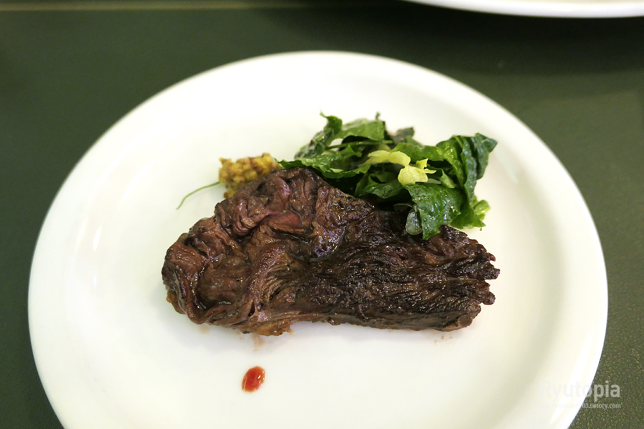 큰 접시에 구운 토시살 스테이크와 약간의 머스타드, 그리고 야채 샐러드가 담겨나오는데, 꾸밈없이 조금 투박한 편.