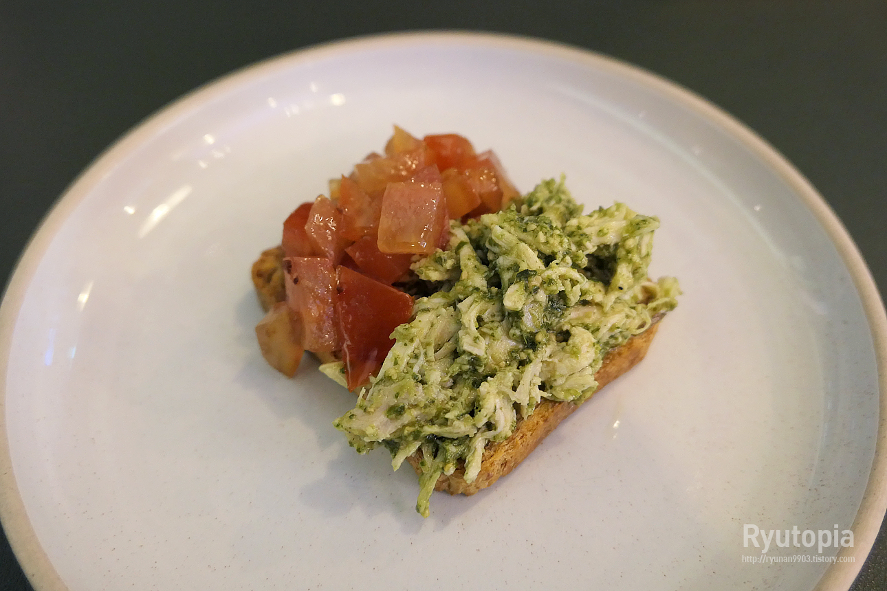 첫 번째 요리(아뮤즈부쉬) : 부르스게타 빵과 바질에 절인 닭가슴살, 그리고 토마토 샐러드.