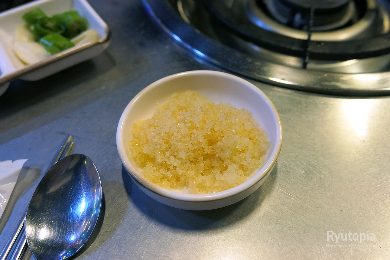 여기는 이렇게 작은 그릇에 날치알이 담겨나오는데요, 이것도 쭈꾸미 먹을 때 찍어먹거나 얹어먹으면 좋다고 하네요.