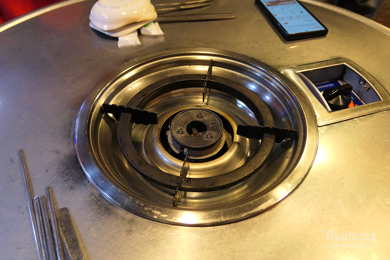 드럼통 테이블을 사용하고 있는데, 테이블마다 가스렌지 달려있고요.