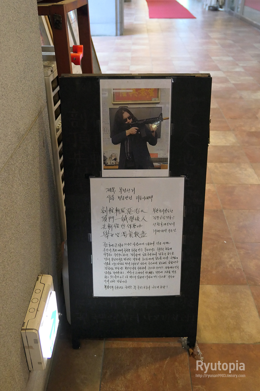 그리고 매장 출입문에 가장 크게 붙어있는 건 부활할 거라고 하는 전임 대통령의 사진. 위에 쓴 한자는 '자유대한민국만세' 인가...