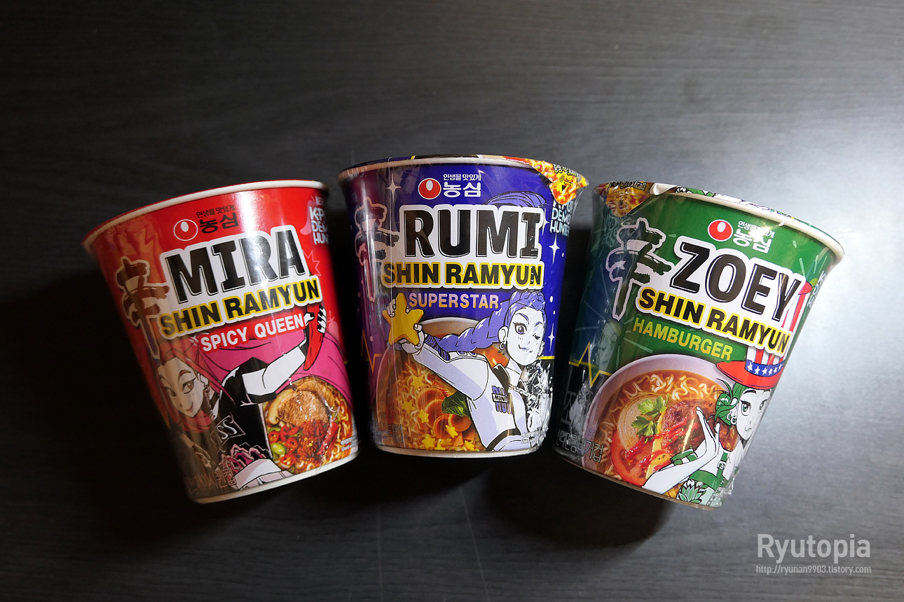 오늘 소개할 상품은 농심의 미니 컵라면 '케이팝 데몬 헌터스 신라면 3종' 으로 가격은 편의점 기준 각 1,300원입니다.