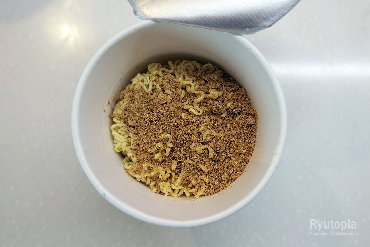 면 위에 분말스프 파우치를 적당히 뿌리고(확실히 이건 다른 제품에 비해 분말스프 색이 다릅니다)