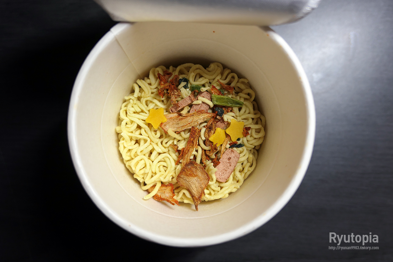 세 종류의 컵라면 중 가장 이 쪽이 건더기가 충실한 편인데요, 별 모양의 어묵과 함께 건조햄, 야채, 그리고 뭔가