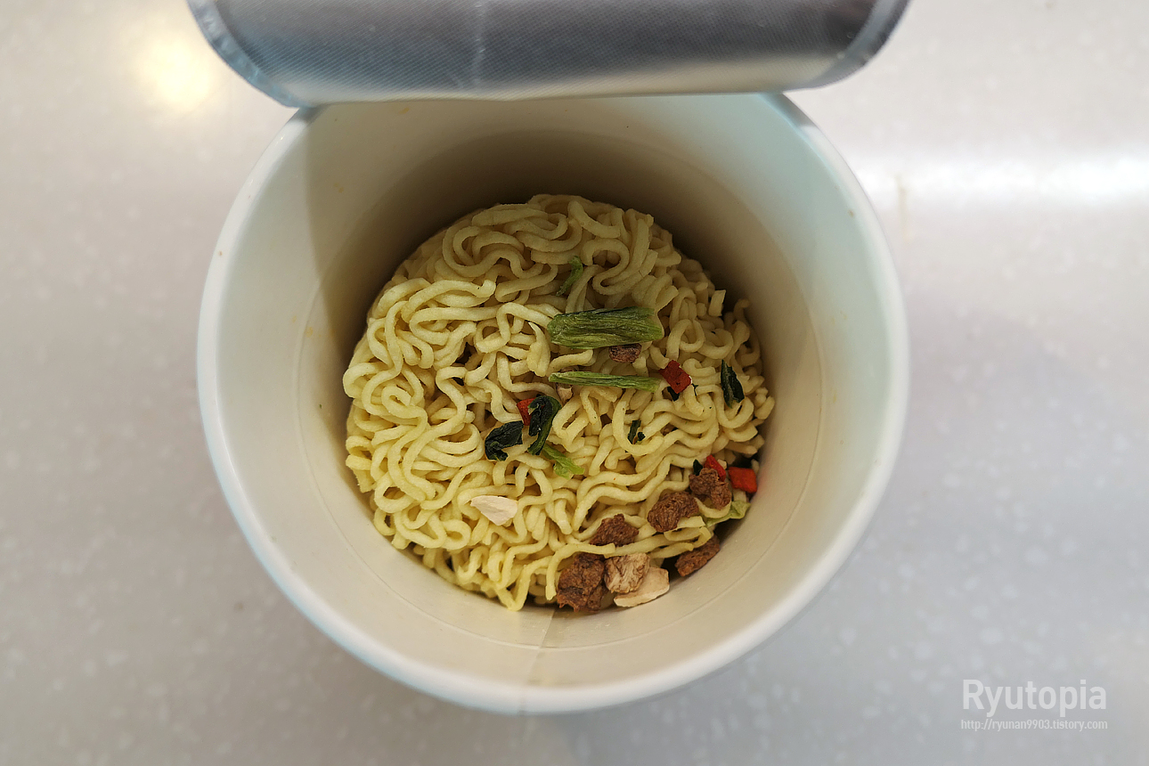 용기 안에는 둥근 면과 함께 고기, 버섯, 당근, 청경채 등의 건조 후레이크가 기본으로 들어있습니다.