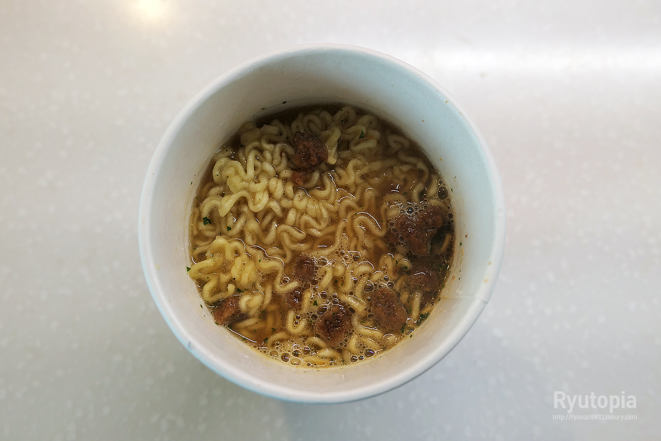 세 종류의 컵라면 중 이 쪽이 가장 맛있어보이게 잘 익었네요.