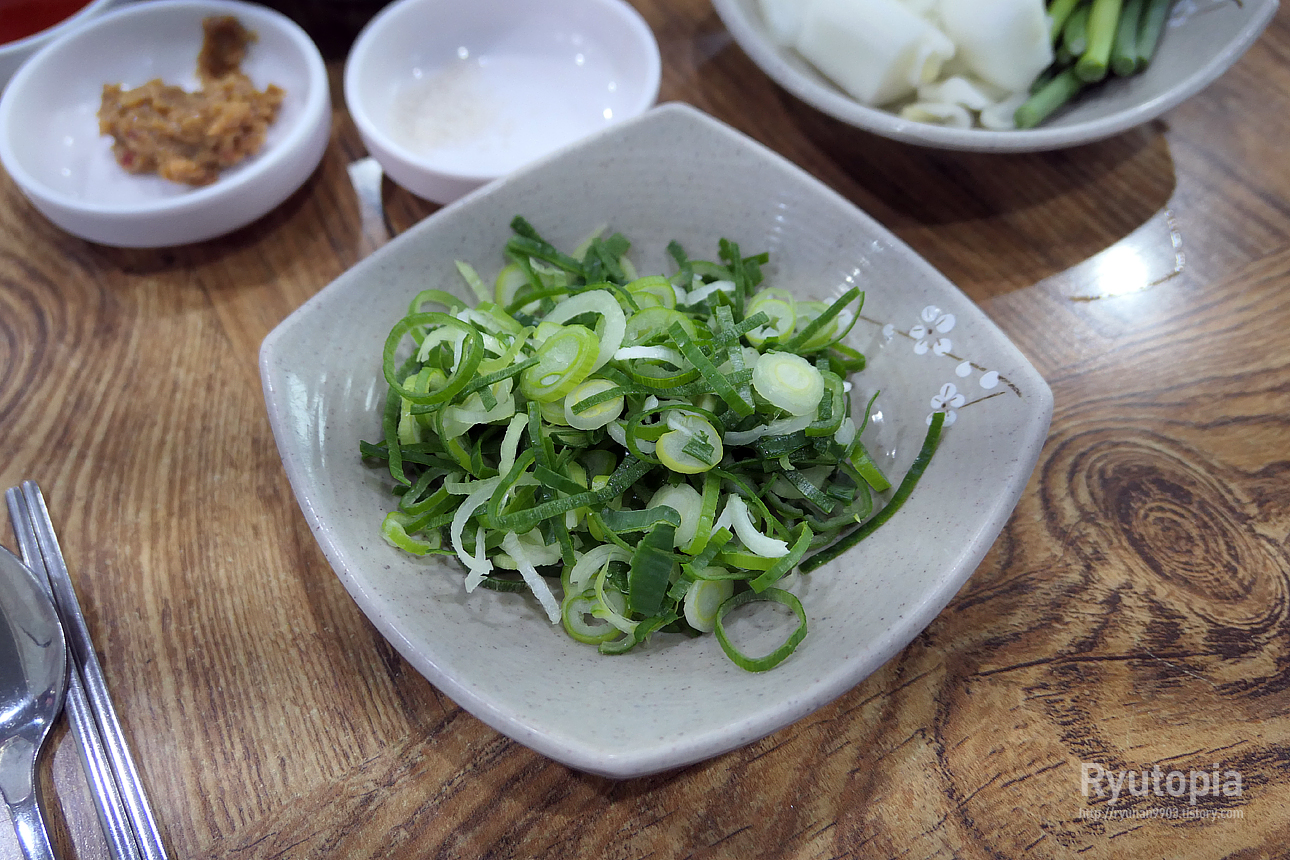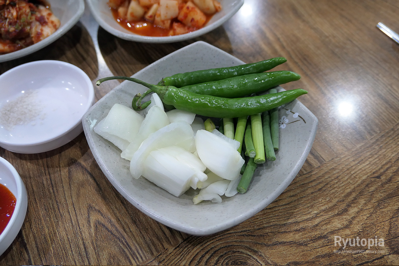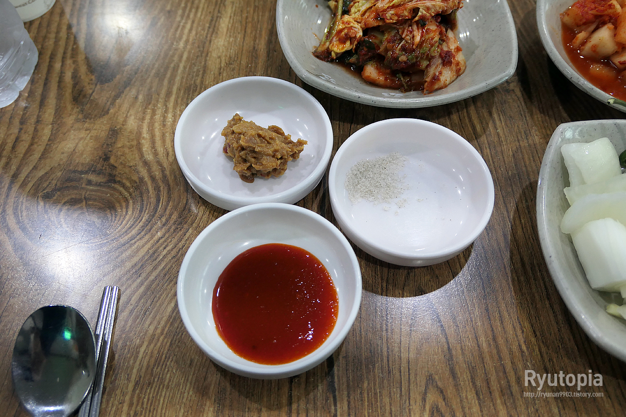 양념장이 일반적인 다대기와 달리 좀 묽게 만들어져 기본 비치되어 있고, 소금, 그리고 쌈장 대신 된장이 있습니다.