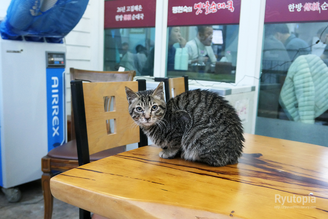 날씨가 되게 추웠는데 가게 앞 난로 피워놓은 곳에서 저렇게 자리 깔아놓고 앉아있더군요. 여기서 키우는 애였을까?