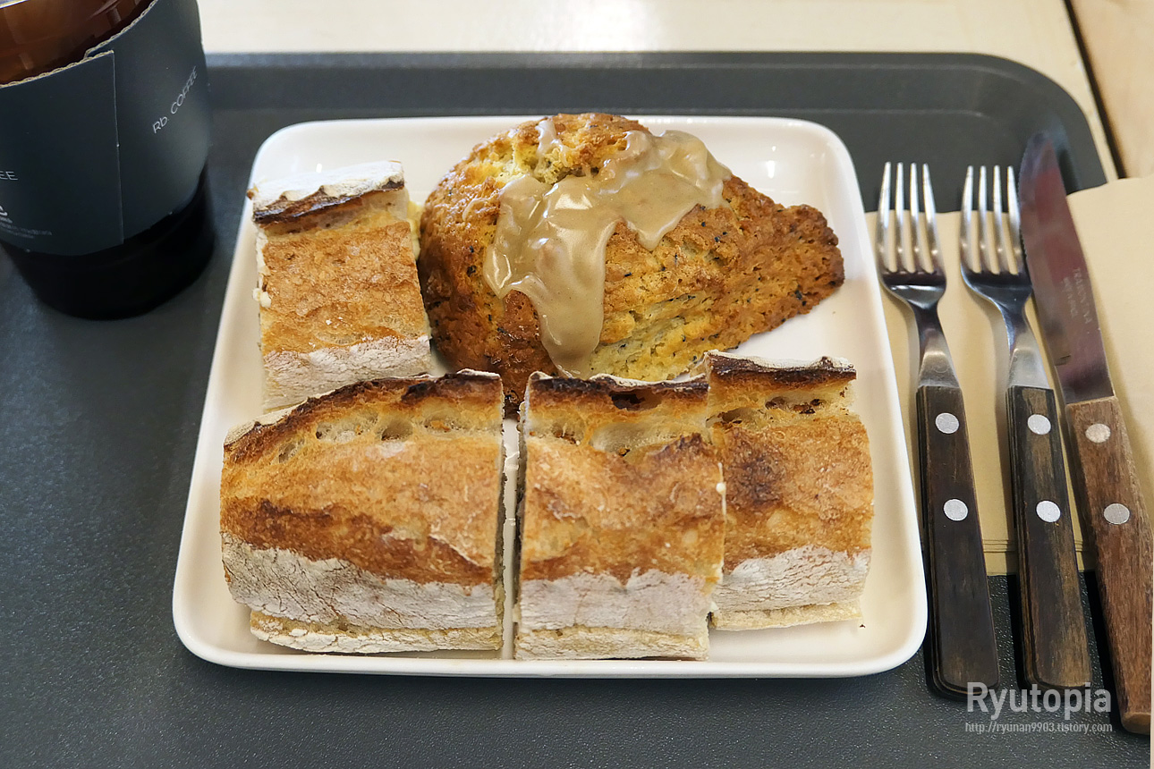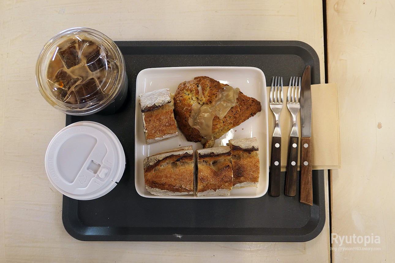 일단 먹고 갈 빵은 얼 그레이 스콘, 그리고 크림치즈 무화과 바게트 이렇게 두 개, 그리고 따뜻한 커피.