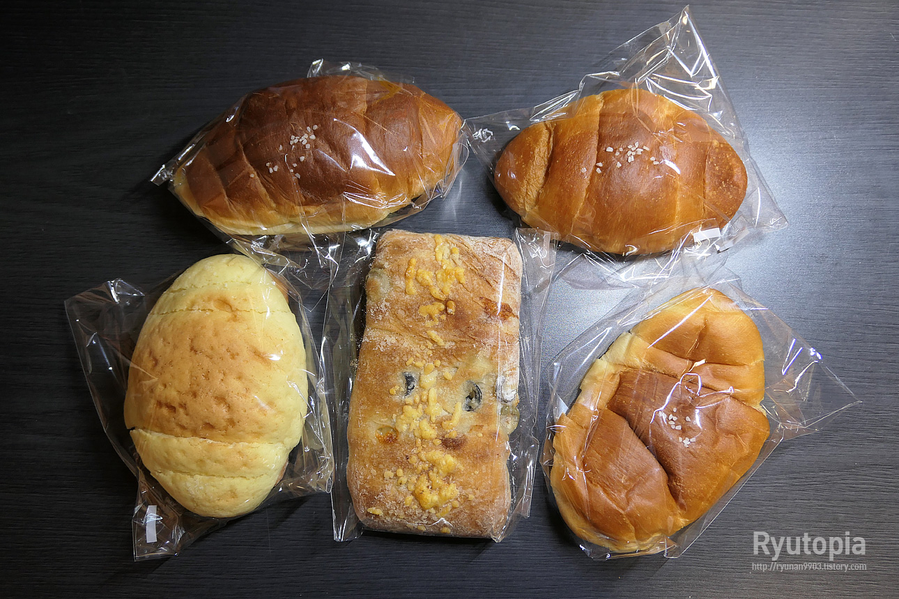 이번에 구매한 건 기본 소금빵 세 개, 그리고 비스켓 소금빵과 올리브 치즈 치아바타.