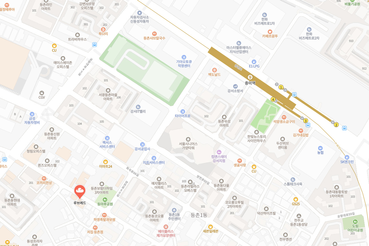 ※ 루브레드 본점 찾아가는 길 : 지하철 9호선 증미역 4번출구 하차 후 직진, 맥도날드 끼고 좌회전 후 등마루공원 끼고 우회전