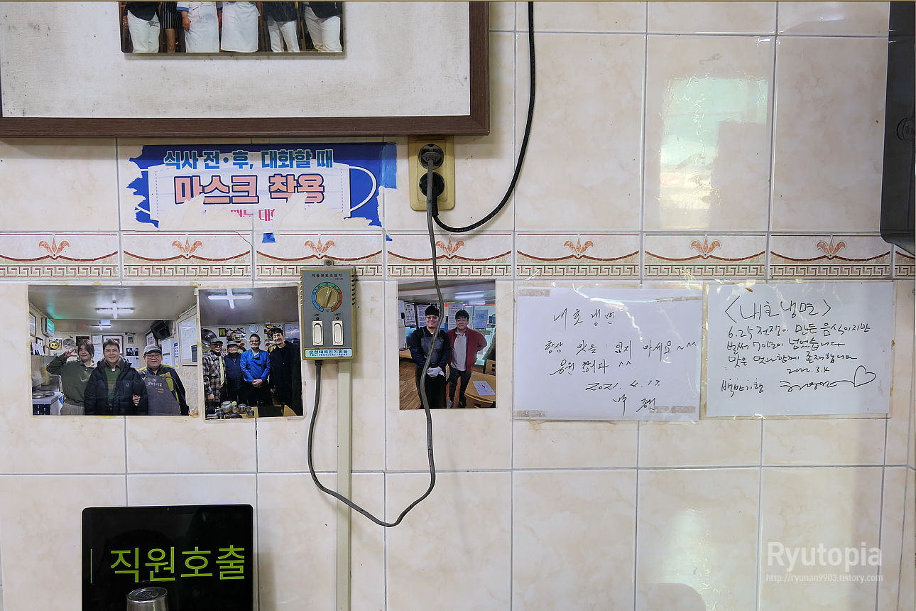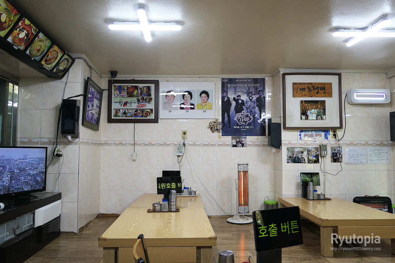 테이블은 좌식, 입식 테이블이 반반 섞여있는 모습, 그리고 뒤에 보면 예전 백종원의 3대천왕에도 나온 흔적이 보인다.