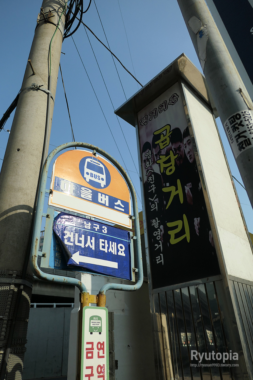 마을버스 타는 정류장은 '곱창거리' 라는 이름의 곱창 가게들이 모여있는 거리 입구인데, 특이하게 버스 정류장 표지판이