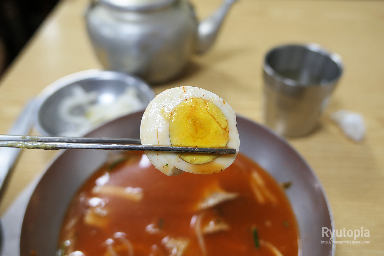 이 가게 국물은 상당히 마일드하다. 아까 말한 평양냉면 국물과 매우 흡사함. 양념장을 풀었는데도 자극적인 맛은 강하지 않았다.
