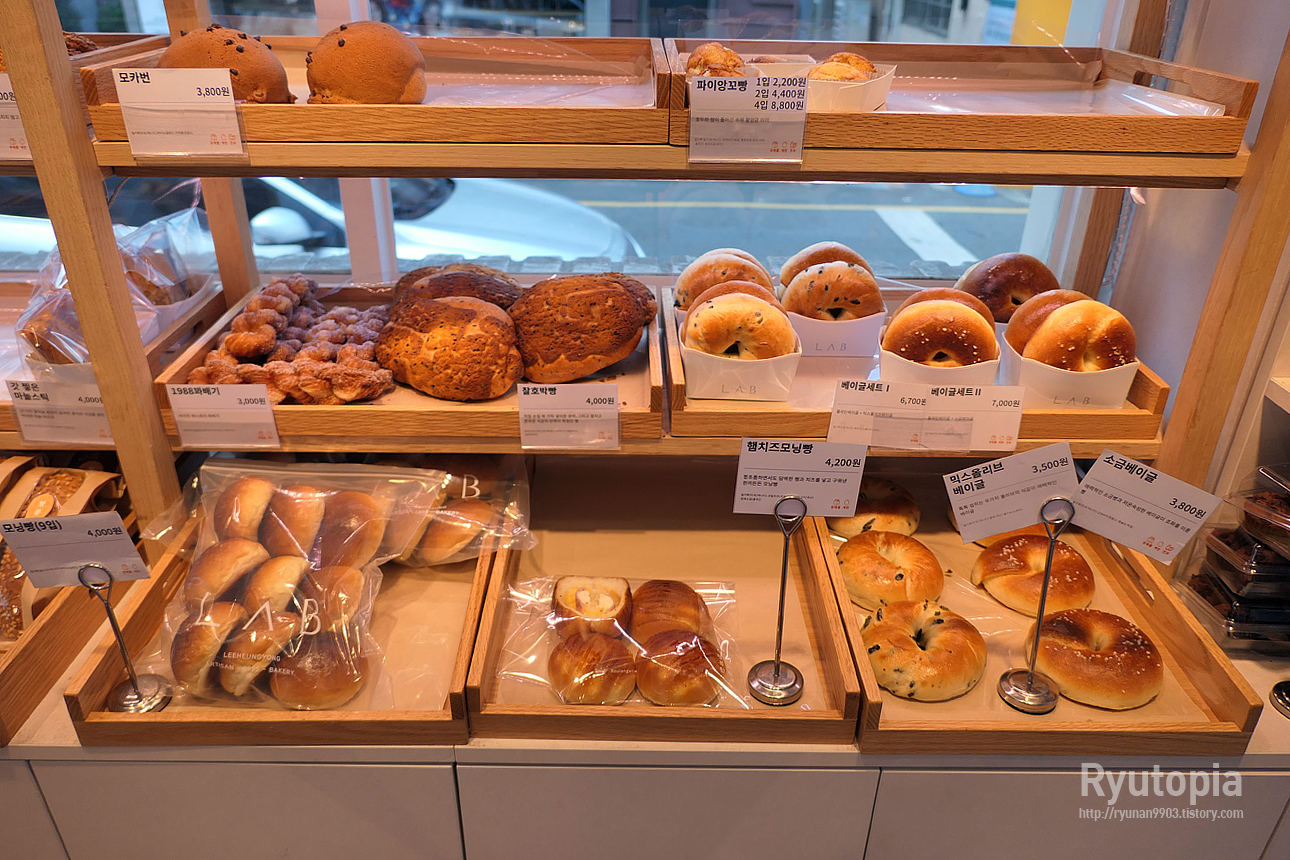 베이글, 모닝빵, 꽈배기, 호박빵 등 일반 빵집에서도 찾아볼 만한 것들이 많다. 가격은 아주 높진 않은 편.