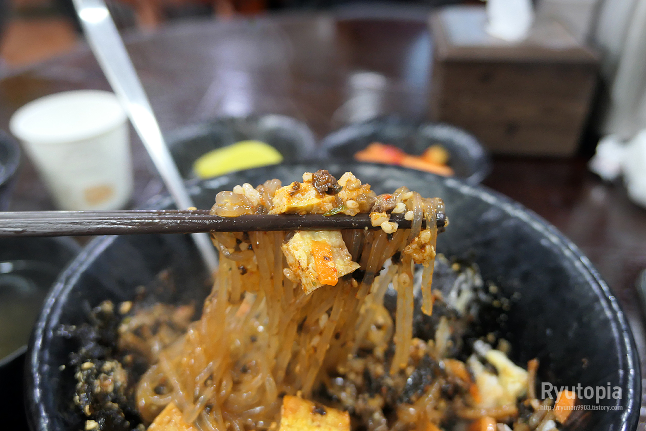 바닥에 당면 삶은 거 조금 있고 그 위에 김가루, 깨, 고추장 수북하게 뿌린 것밖에 안 보이는데...