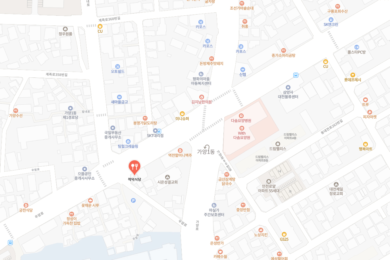 ※ 적덕식당 찾아가는 길 : 대전광역시 동구 우암로 220-3(가양동 343-10), 대전복합터미널에서 도보 약 1.1km
