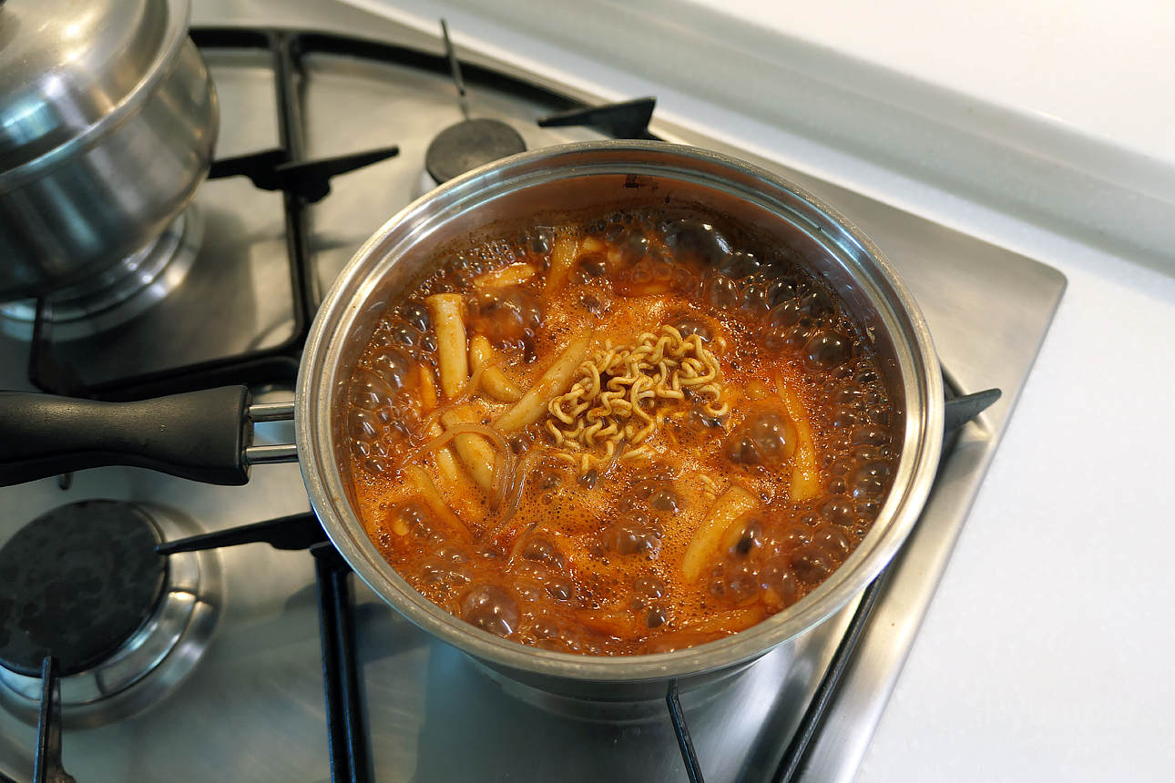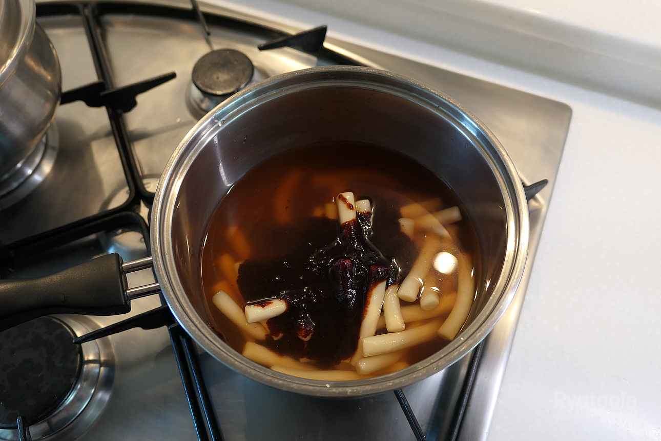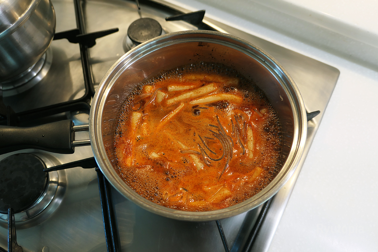 냄비에 물 400ml를 넣고 떡, 그리고 소스를 먼저 넣은 뒤 끓이기 시작합니다.