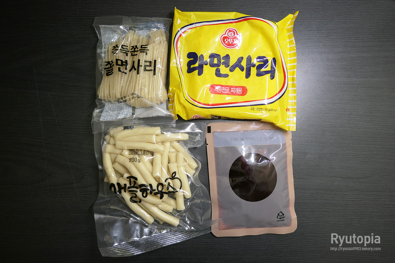 왼쪽 위부터 시계순서대로 쫄면사리, 라면사리, 소스, 그리고 밀가루떡으로 구성되어 있습니다.