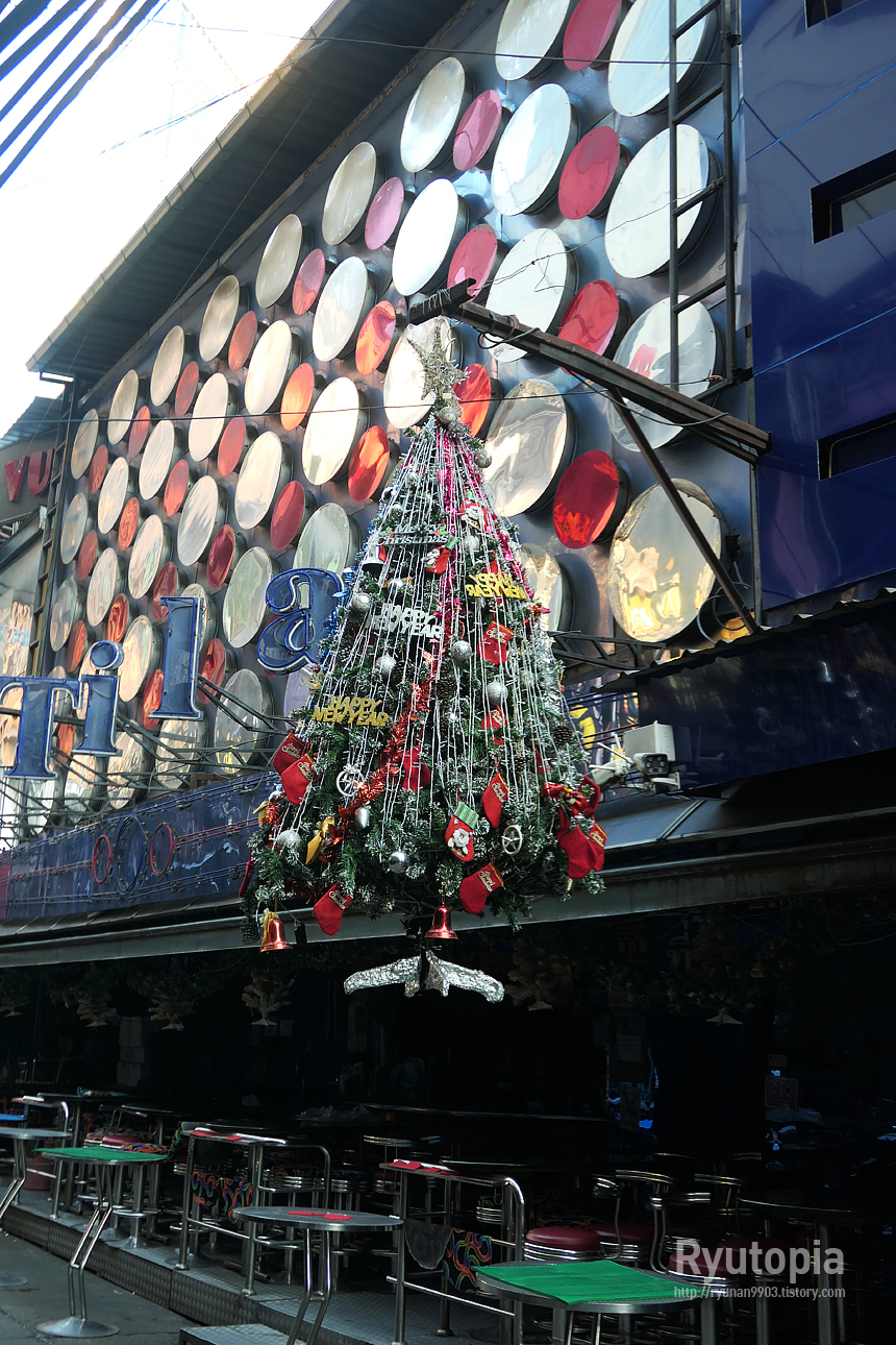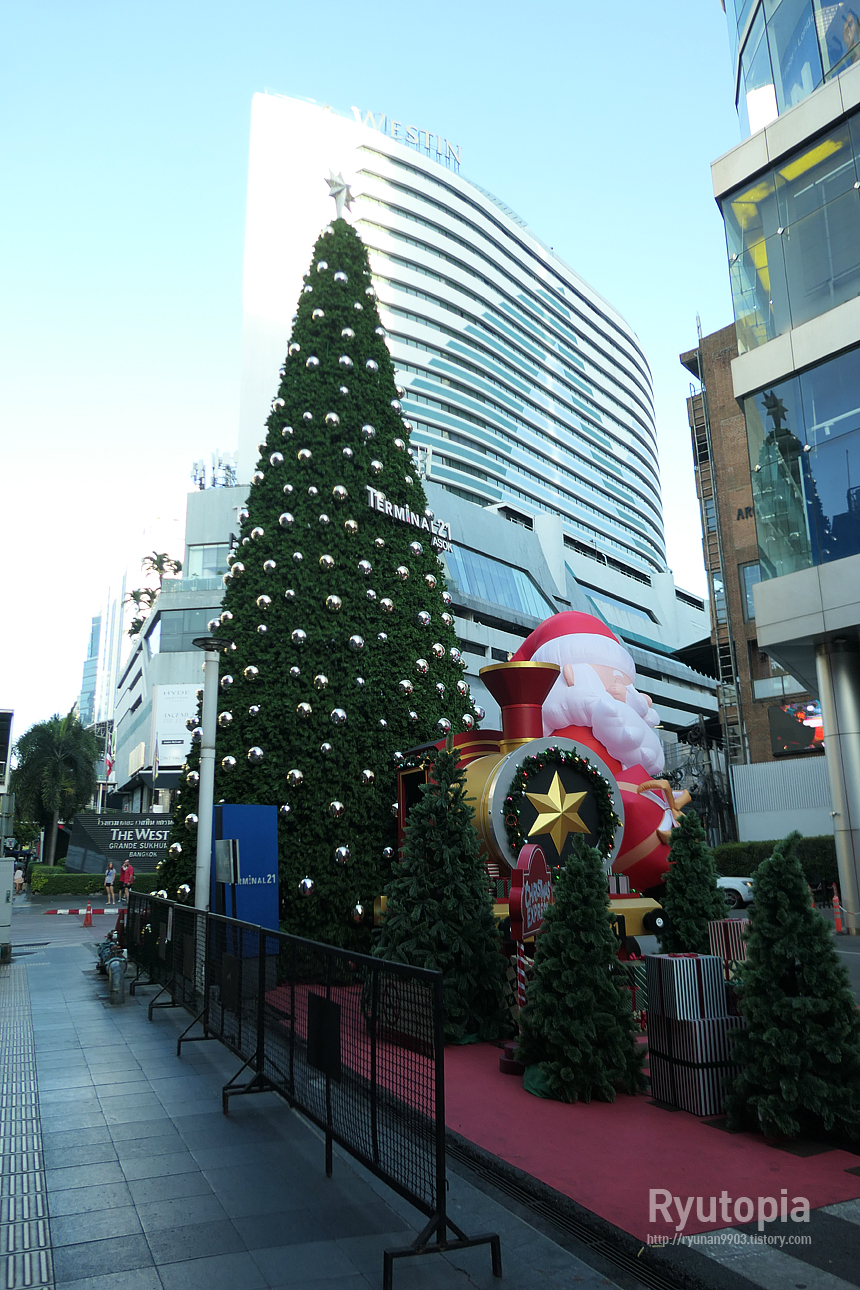 크리스마스 트리, 그리고 산타 풍선인형이 세워져 있는 터미널21 쇼핑몰 앞.