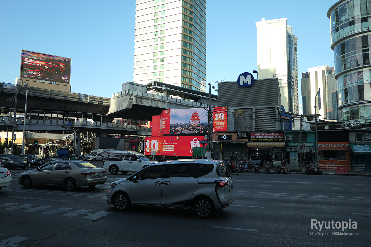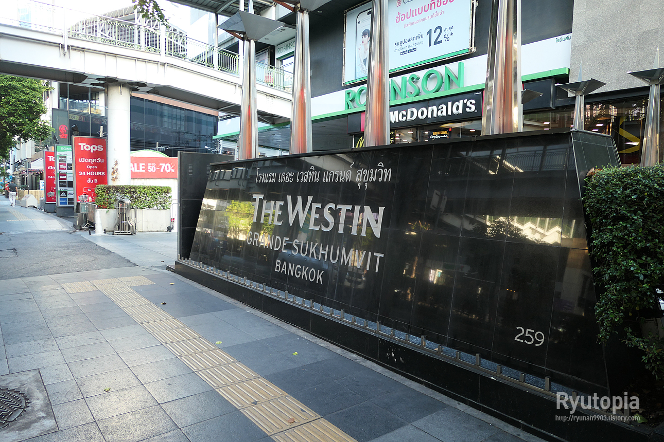 그 쇼핑몰 바로 옆의 '더 웨스턴 그랜드 스쿰윗 방콕' 현판 뒤에 있는...