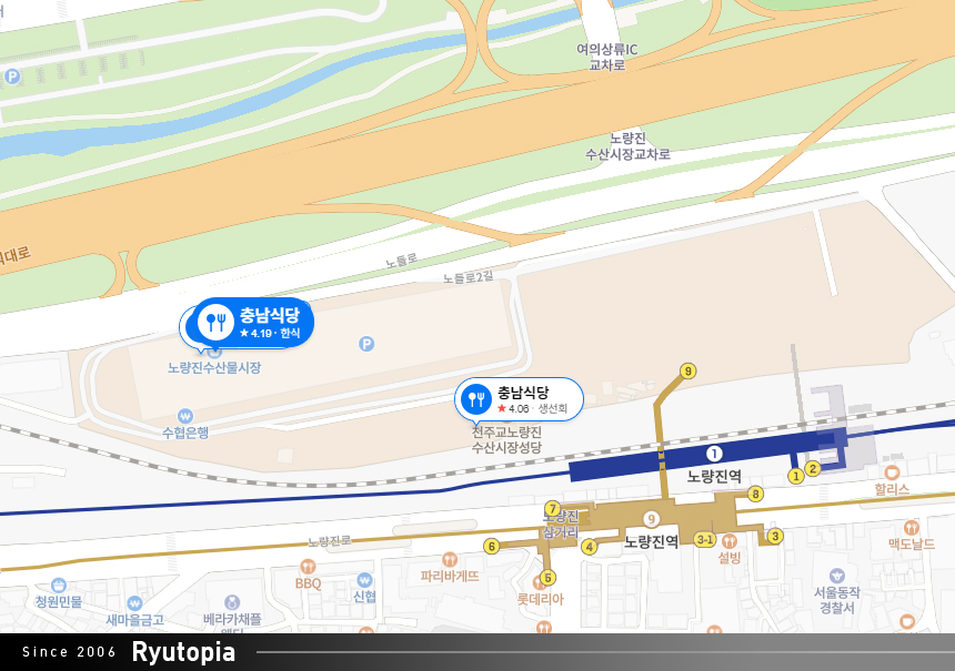 ※ 노량진 수산시장 찾아가는 길 : 지하철 1, 9호선 노량진역 9번출구 하차, 또는 7번출구 하차 후 직진, 지하도 건너
