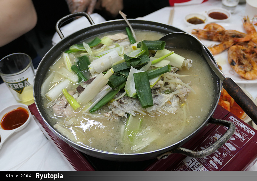 회와 새우를 어느 정도 즐긴 뒤에 이어진 서더리로 끓인 지리탕.