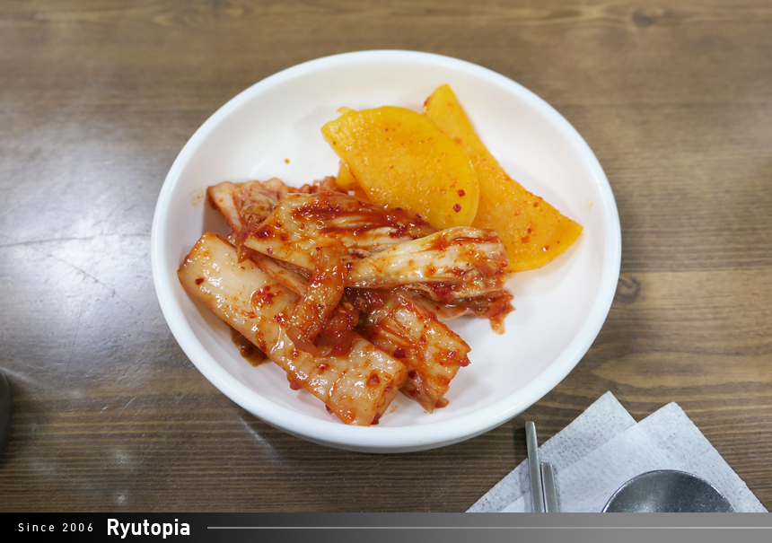 반찬은 배추김치와 고춧가루에 버무린 단무지, 두 가지만 있습니다.