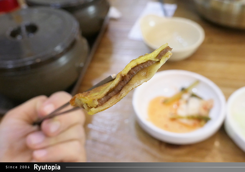 종잇장처럼 얇은 쇠고기가 계란옷 사이에 들어있는데, 씹을수록 고소한 맛이 매력적이에요.
