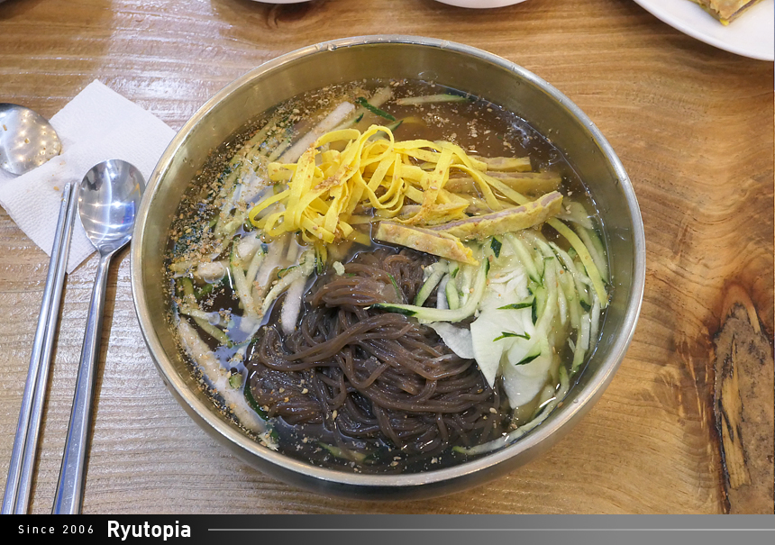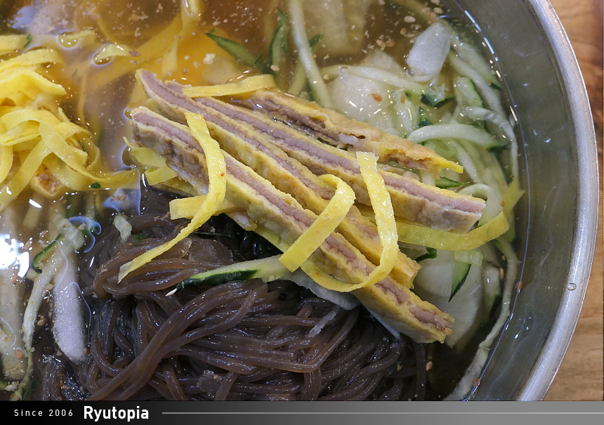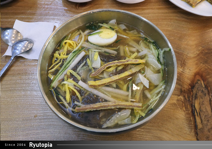 쫄깃한 면발과 함께 느껴지는 그동안 먹어왔던 물냉면과는 다른 오묘한 해물육수 특유의 감칠맛이 일품.