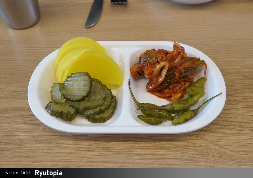 반찬은 셀프로 가져다먹을 수 있는데, 단무지, 오이피클, 할라피뇨 고추피클, 그리고 배추김치 네 가지가 있습니다.