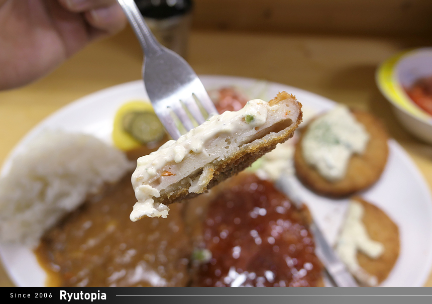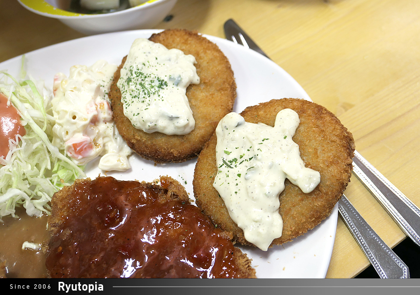 두 덩어리가 튀겨 나오고 생선까스처럼 튀김 위에 타르타르 소스를 얹어냈습니다.
