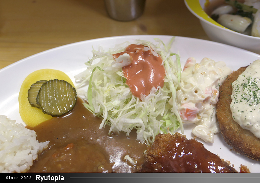 사이드로는 오이피클과 단무지, 케요네즈 소스를 뿌린 양배추 채썬 것과