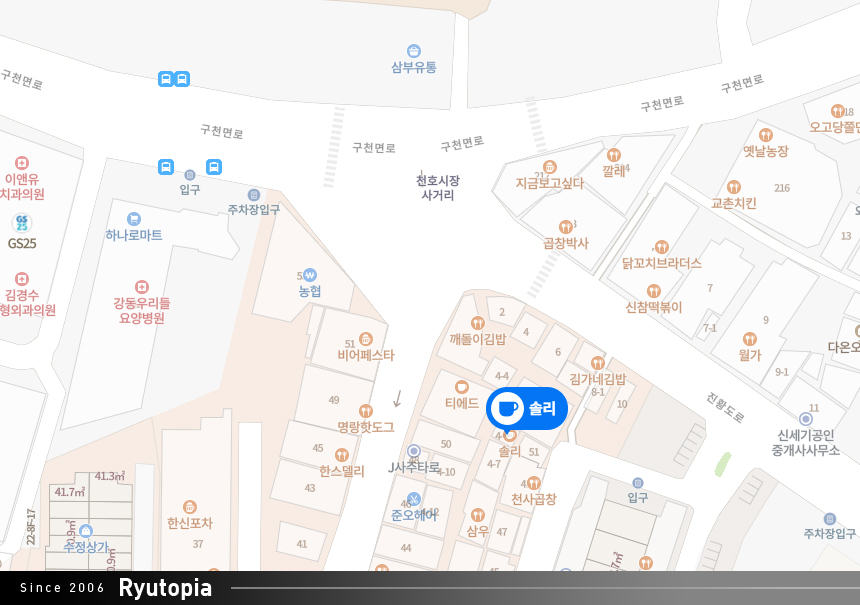 ※ 솔리 찾아가는 길 : 천호시장 사거리(천호구사거리)에서 로데오거리 방향 안쪽 골목, 안녕식당 바로 옆 위치