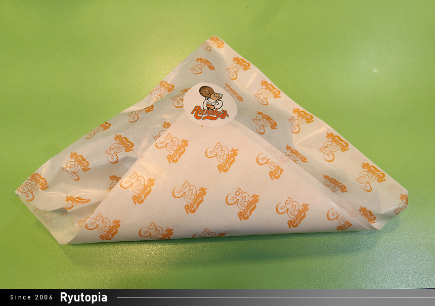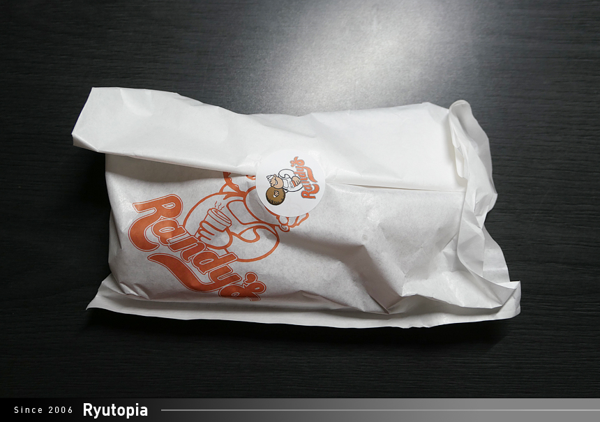 도넛 여러 개를 구매하면 박스에 담아주는데 낱개만 사면 이렇게 종이에 스티커를 붙여 포장해줍니다.