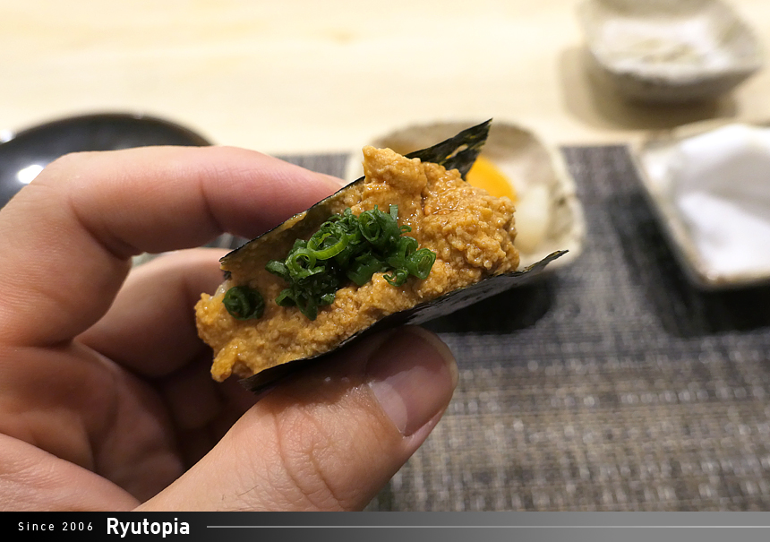 밥이나 다른 재료 없이 김 위엔 아귀 간, 그리고 쪽파만 올라가 있습니다.