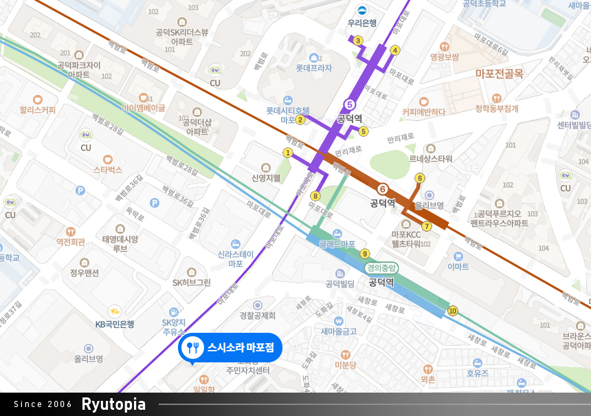 ※ 스시소라 마포점 찾아가는 길 : 지하철 5,6,공항,경의중앙 공덕역 8번출구 하차 후 마포역방향 직진