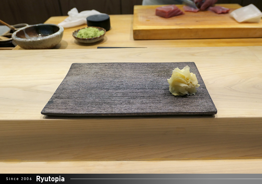 초밥을 놓는 접시 한쪽엔 초생강이 동그랗게 뭉쳐진 채 올라가 있습니다.