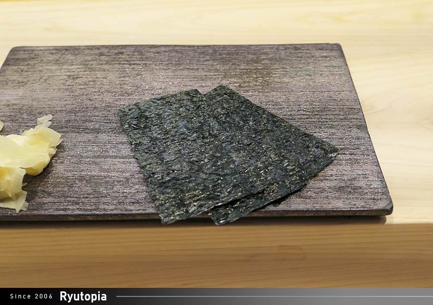 카이센동와 함께 초밥 접시 위에 조미되지 않은 김 세 장이 나왔습니다.