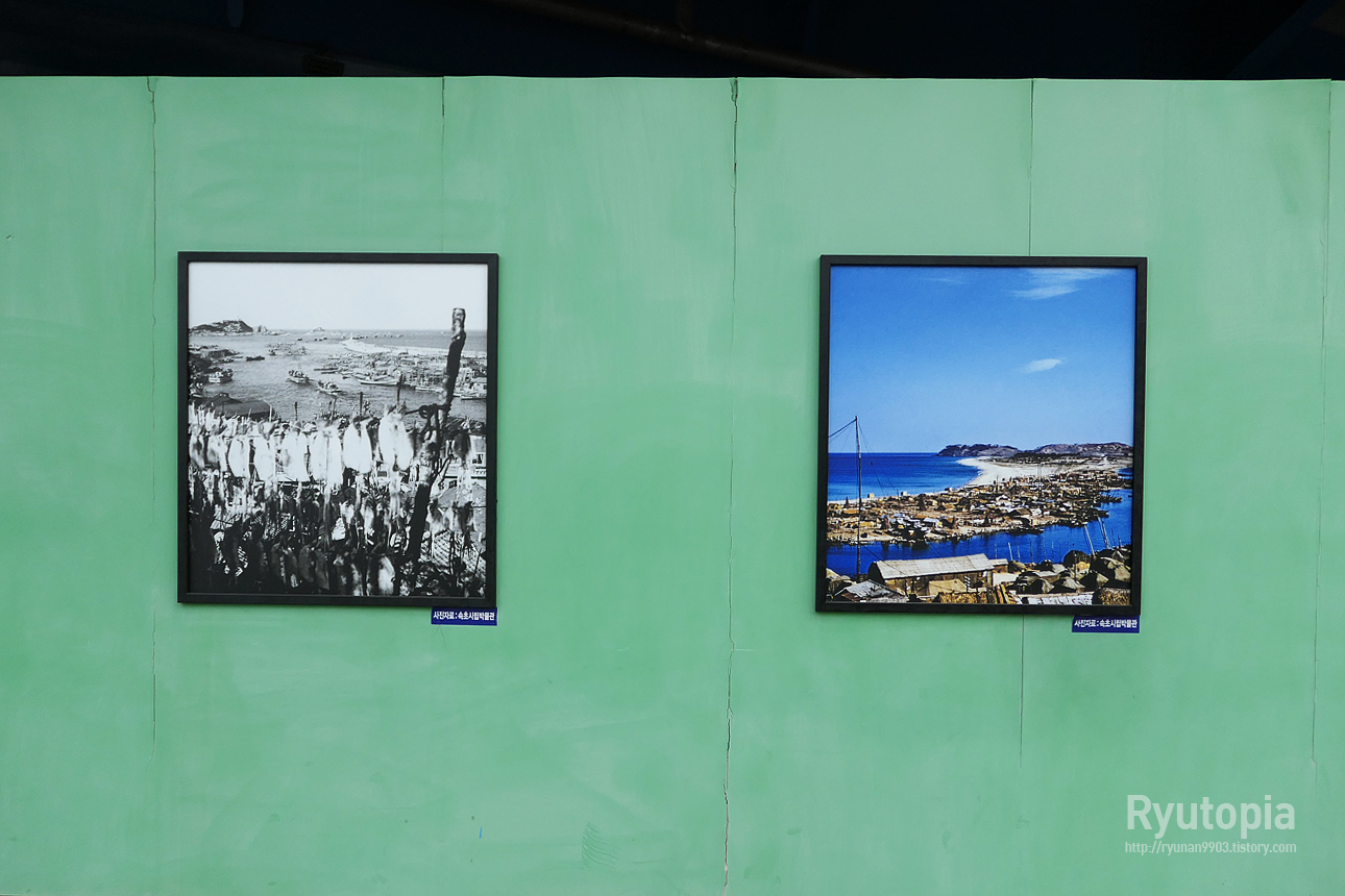 흑백 사진과 컬러 사진에 각각 하나씩 담긴 옛날의 속초 모습.
