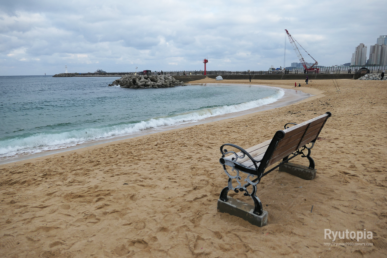 해변에 덩그러니 놓여 있는 벤치 하나.