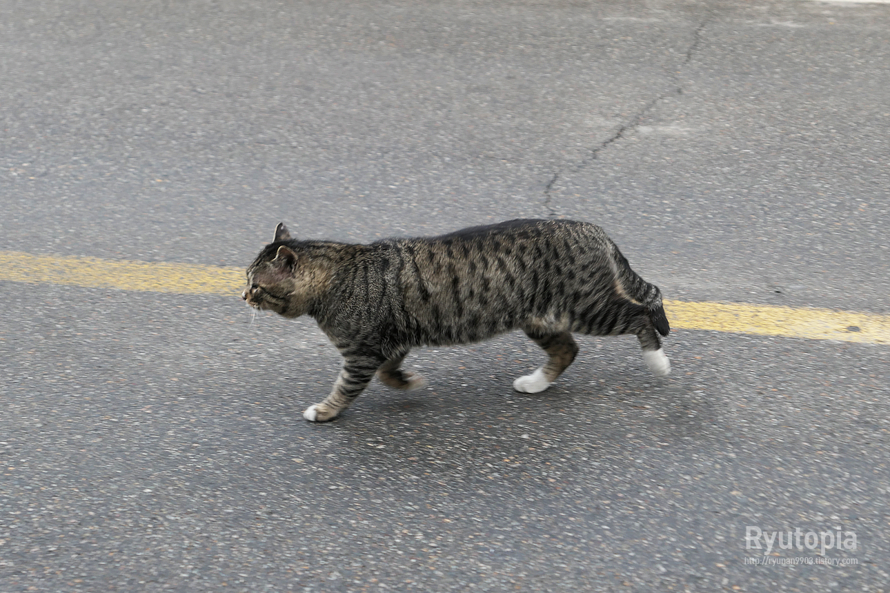차도 앞을 유유히 지나가는 통통하게 살 오른 길고양이 한 마리.
