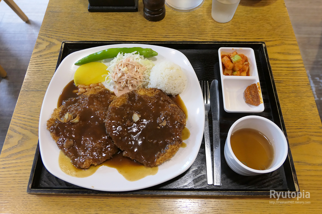 구성만 봐도 경양식 스타일의 돈까스 전문점이라는 걸 알 수 있는 것들.