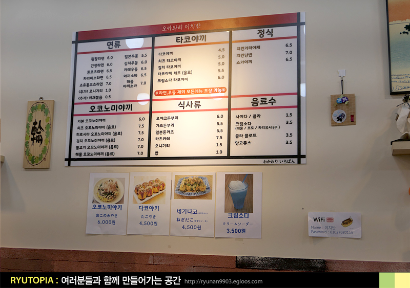 오사카에서 살다 오신 아주머니께서 직접 요리하는 것이라 타코야키와 오코노미야키가 주력 메뉴입니다.