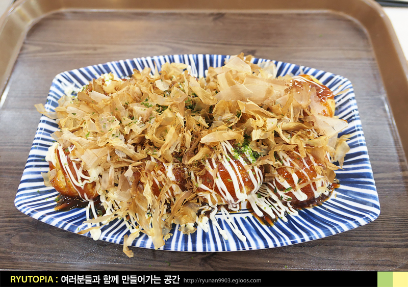 가쓰오부시(가다랭이포)를 정말 많이 뿌려 열기에 마구 흔들리는 모습이 식욕을 당기게 하는군요.