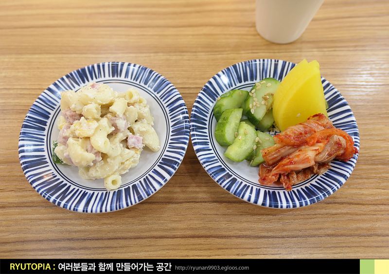 김치나 단무지는 그렇다 치더라도 기본찬으로 직접 만든 오이절임과 마카로니라니...