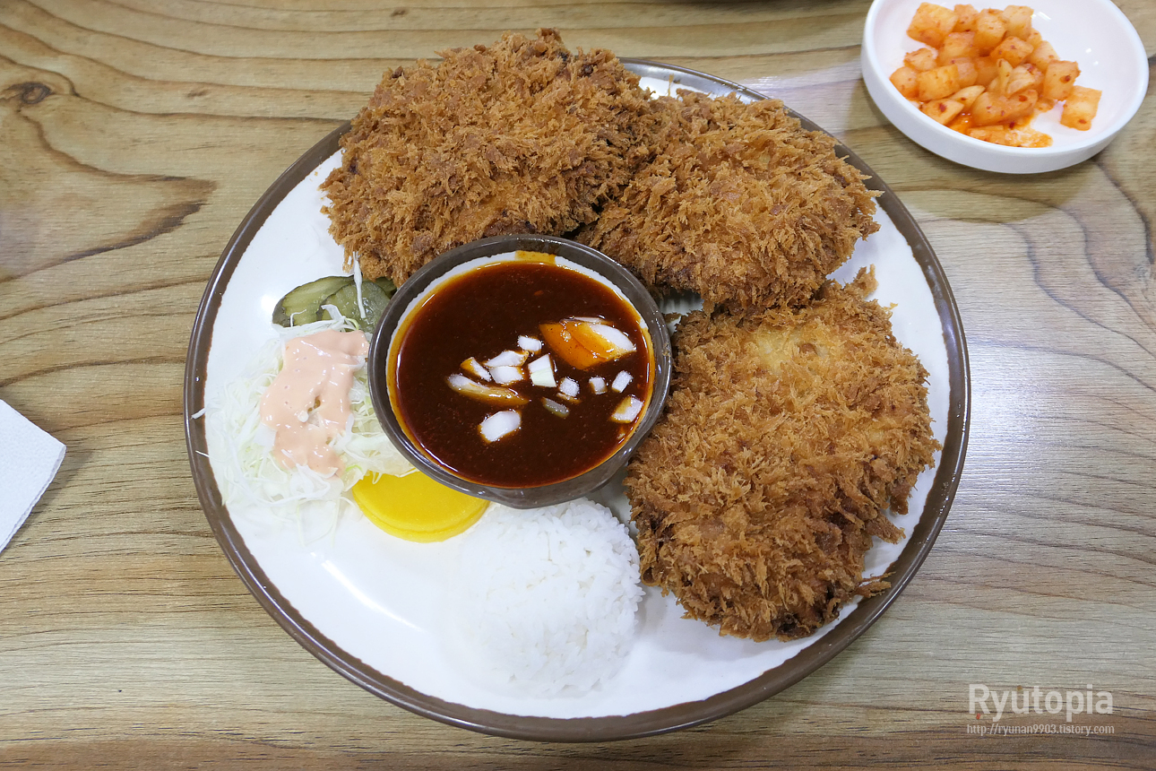 그리고 원래 기본 돈까스는 두 덩어리가 나오는데 1,000원 추가해서 곱배기 주문시 세 덩어리가 제공됩니다.
