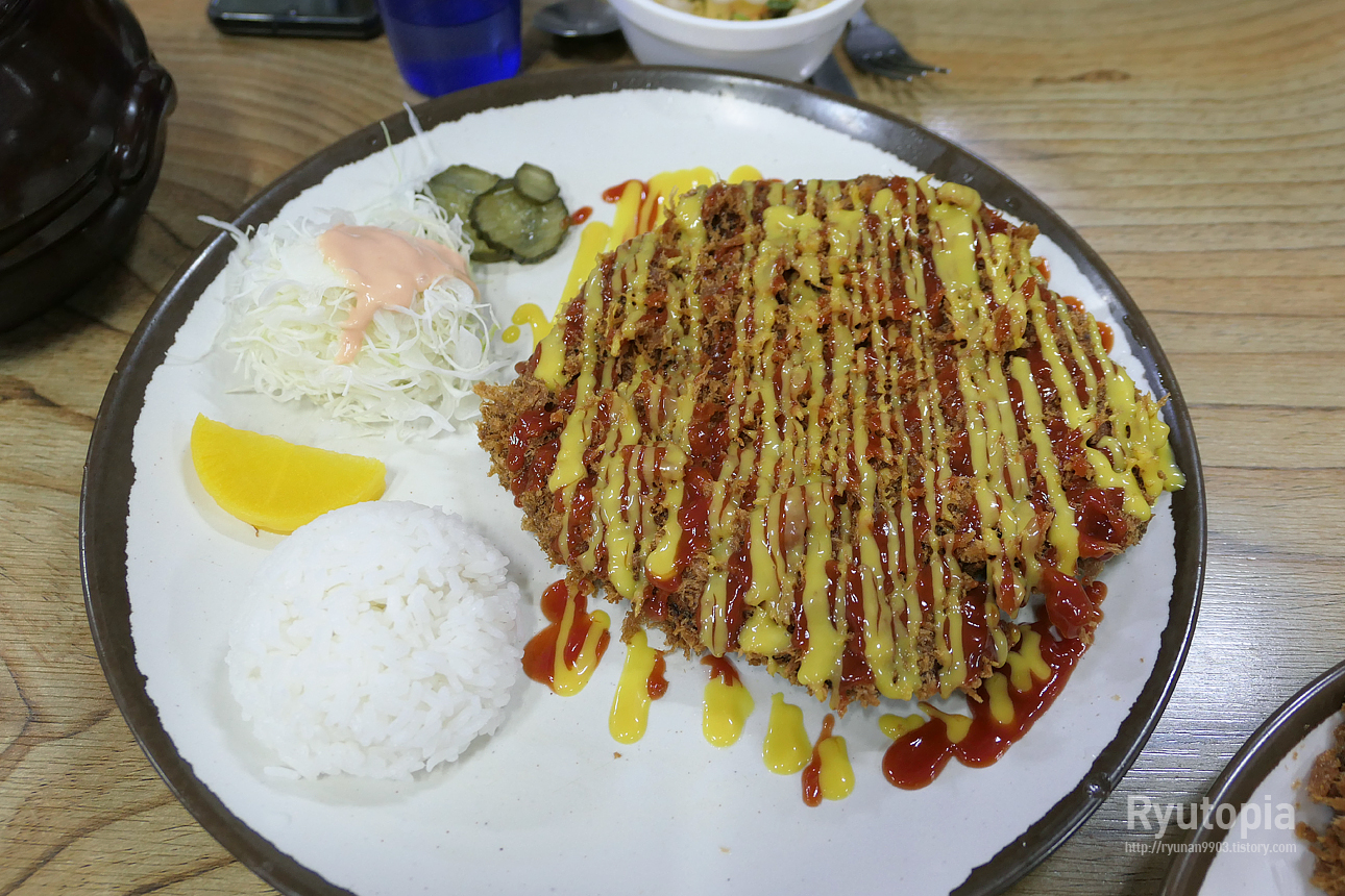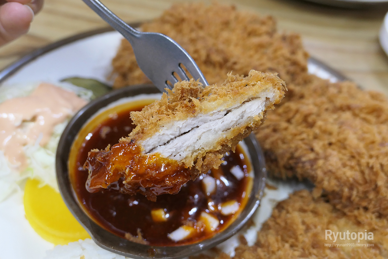 그만큼 두툼하게 돼지고기를 썰어넣어서...라기보단 그냥 튀김옷이 타 돈까스집에 비해 꽤 두껍기 때문.