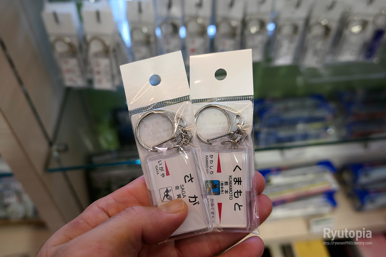 큐슈 지역 JR 철도역들의 역명판 열쇠고리도 종류별로 진열되어 있다.